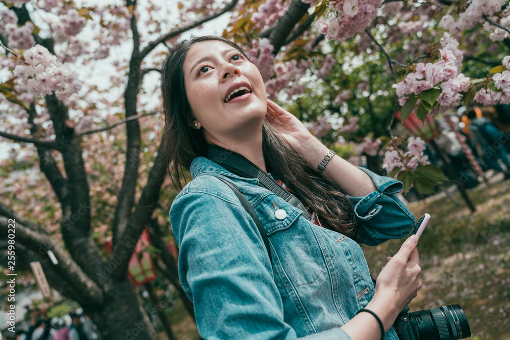 asian girl photographer holding professional camera while travel